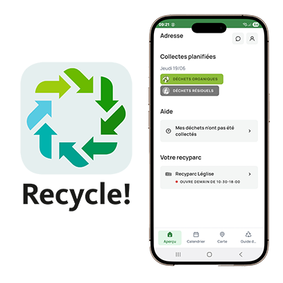Hyper pratique, l'application Recycle! vous donne toutes les infos qui vous concernent : dates de collecte des déchets bio et résiduels, des sacs bleus PMC, des papiers-cartons mais aussi les reports en cas de jours fériés, la localisation des bulles à verre, les horaires des recyparcs, les consignes de tri…