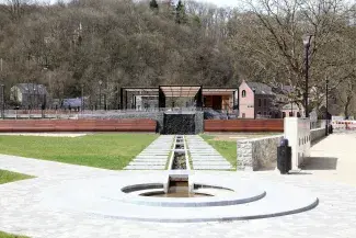 Avec l'aménagement déjà réalisé au pied de l'anticlinal (plan et jeux d'eau), ce nouvel espace incite le public à déambuler dans ce nouveau pôle d'intérêt au nord de la ville qui, du même coup, atténue l'effet de foule fréquemment constaté dans « la plus petite ville du monde ».