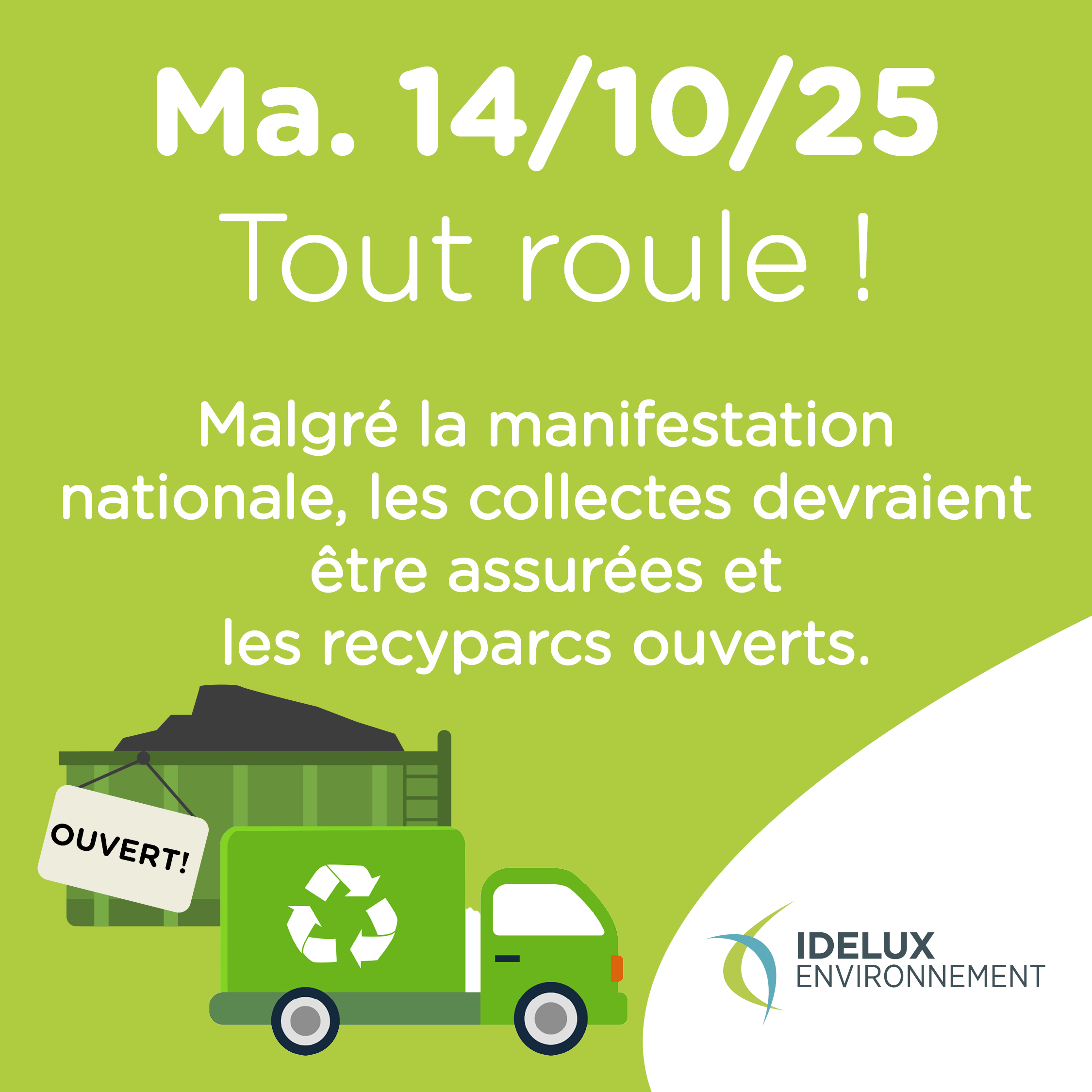 Malgré la manifestation nationale de ce mardi 14 octobre 2025, les collectes en porte-à-porte devraient être assurées et les recyparcs ouverts.