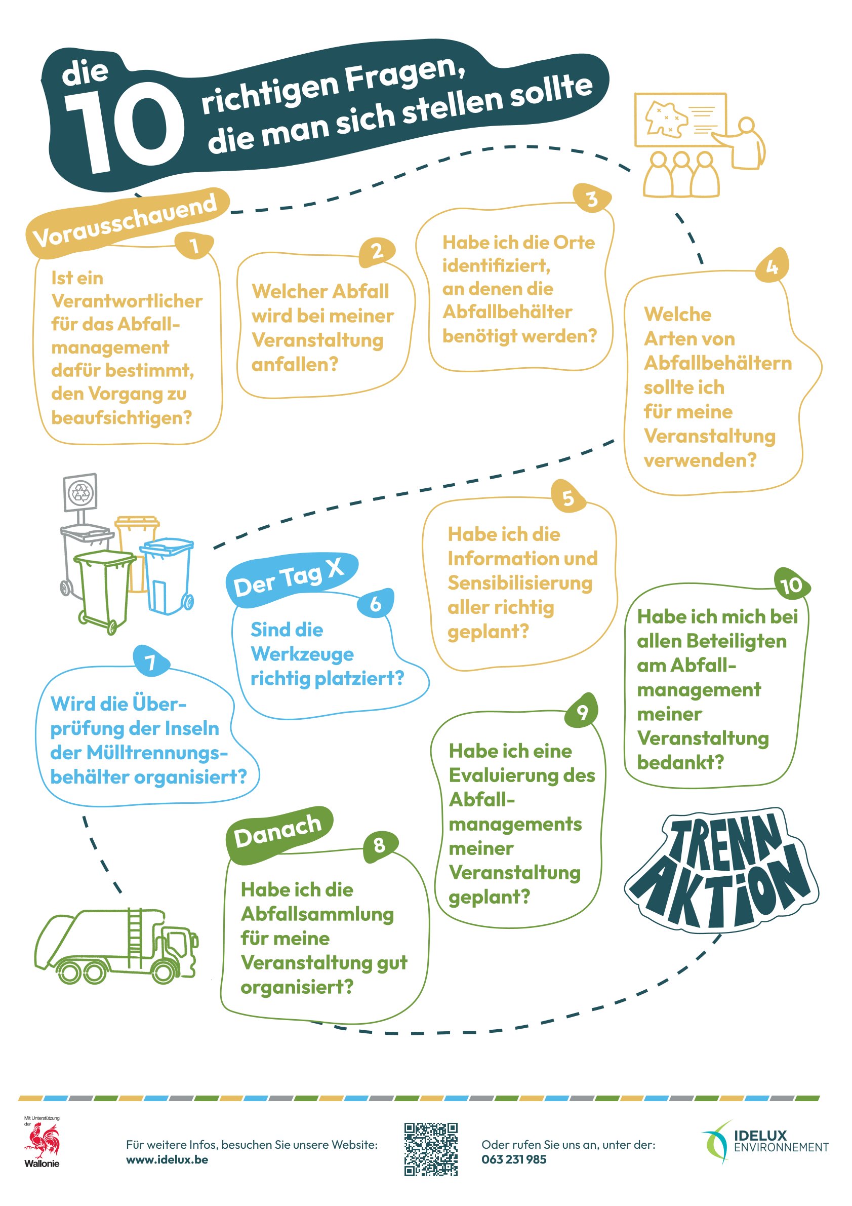 Neben dem Material erfordert die Verwaltung der Abfälle bei einer öffentlichen Veranstaltung eine gründliche Vorbereitung und Organisation. Hier finden Sie die wichtigsten Schritte für den Erfolg Ihrer Veranstaltung. Los geht's mit der „TrennAktion“!