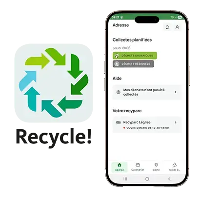 Hyper pratique, l'application Recycle! vous donne toutes les infos qui vous concernent : dates de collecte des déchets bio et résiduels, des sacs bleus PMC, des papiers-cartons mais aussi les reports en cas de jours fériés, la localisation des bulles à verre, les horaires des recyparcs, les consignes de tri…
