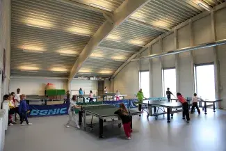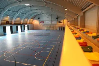 Ce bâtiment de 1 800 m² se compose d'un plateau multisports principal de 44 m x 22 m, de deux salles sportives annexes, de six vestiaires et d'une cafétéria avec salle de réunion. Le développement durable y est intégré avec l'installation de panneaux photovoltaïques et d'une chaudière à pellets.