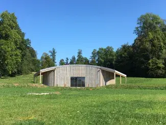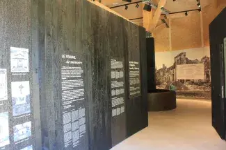 Intégré parfaitement dans le paysage, le bâtiment en bois construit dans le parc du château à Rossignol, village martyr, abrite un centre de visite consacré à la Bataille des Frontières.